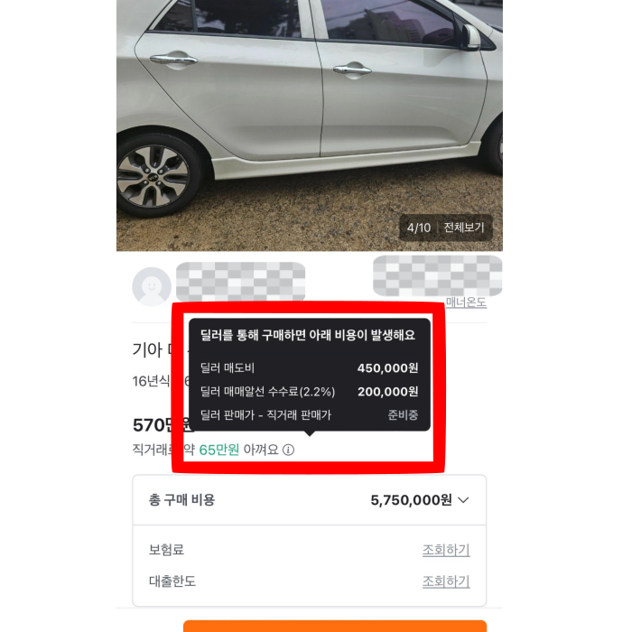 당근 마켓의 중고차 거래의 가장 큰 장점은 바로 딜러 매도비, 수수료가 없다는 것인데요 . 아래 사진처럼 각 구매 비용별로 딜러비용과 수수료가 표기되어 있는데 생각보다 금액이 커서 이 정도 아낄 수 있다 생각하니 당근 마켓의 중고차 거래를 더욱 이용하게 되는 것 같습니다.