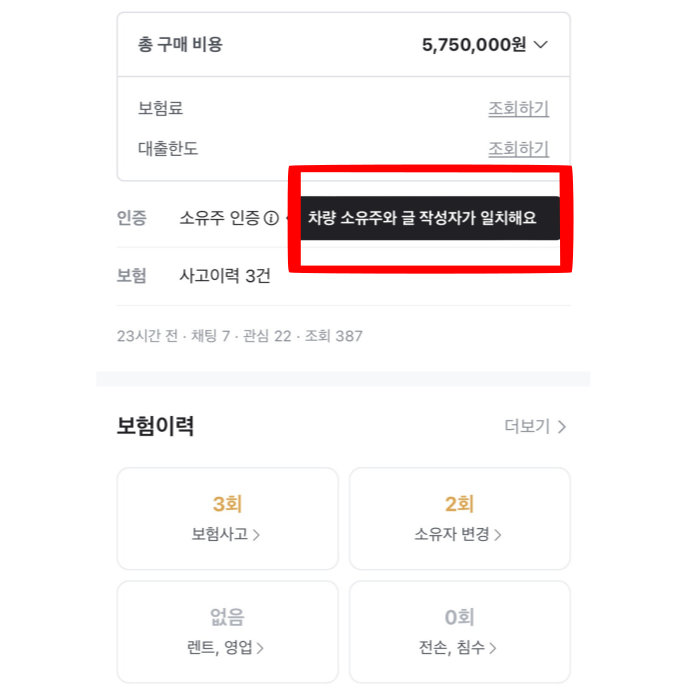 인증 소유주 인증 부분을 보시면 차량 소유주와 글 작성자가 서로 일치하는지 확인하실 수 있고, 사고이력과 소유자 변경여부, 전손이나 침수 등 아주 중요한 부분들까지 보험 이력에 대한 부분을 확인 할 수 있고, 실제 내가 거래후 부담하게 될 보험료와 대출한도까지 바로 조회가 가능합니다.