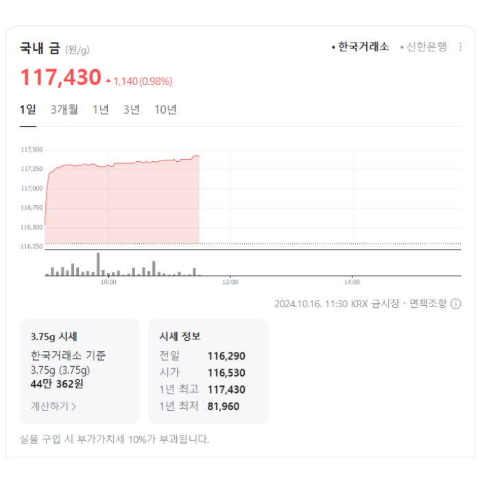 오늘 1g당 금시세는 117,430으로 전일 대비 0.98% 인상되었습니다.